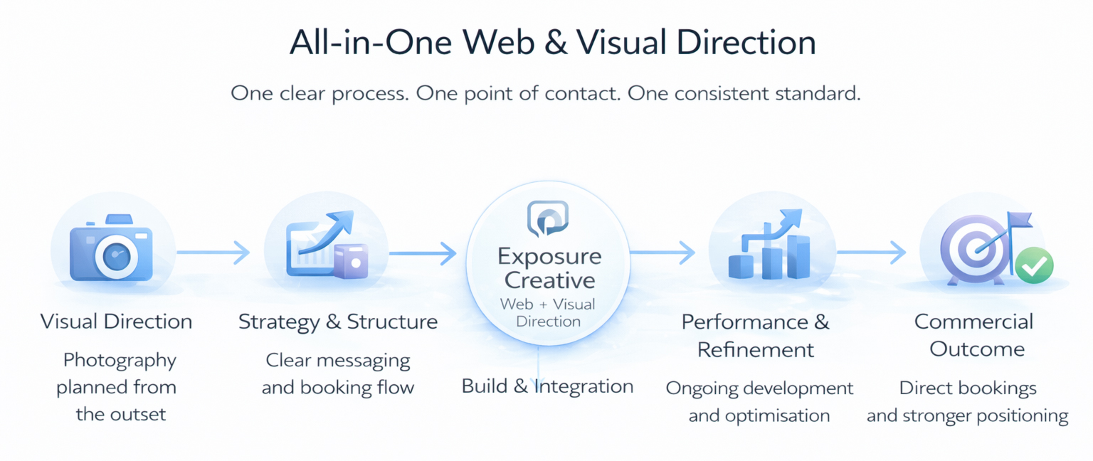 Alongside web development, I work as a professional commercial photographer within the hospitality industry. That experience directly informs how I structure and present properties online, understanding how light, space, detail and atmosphere translate into perception and booking confidence.