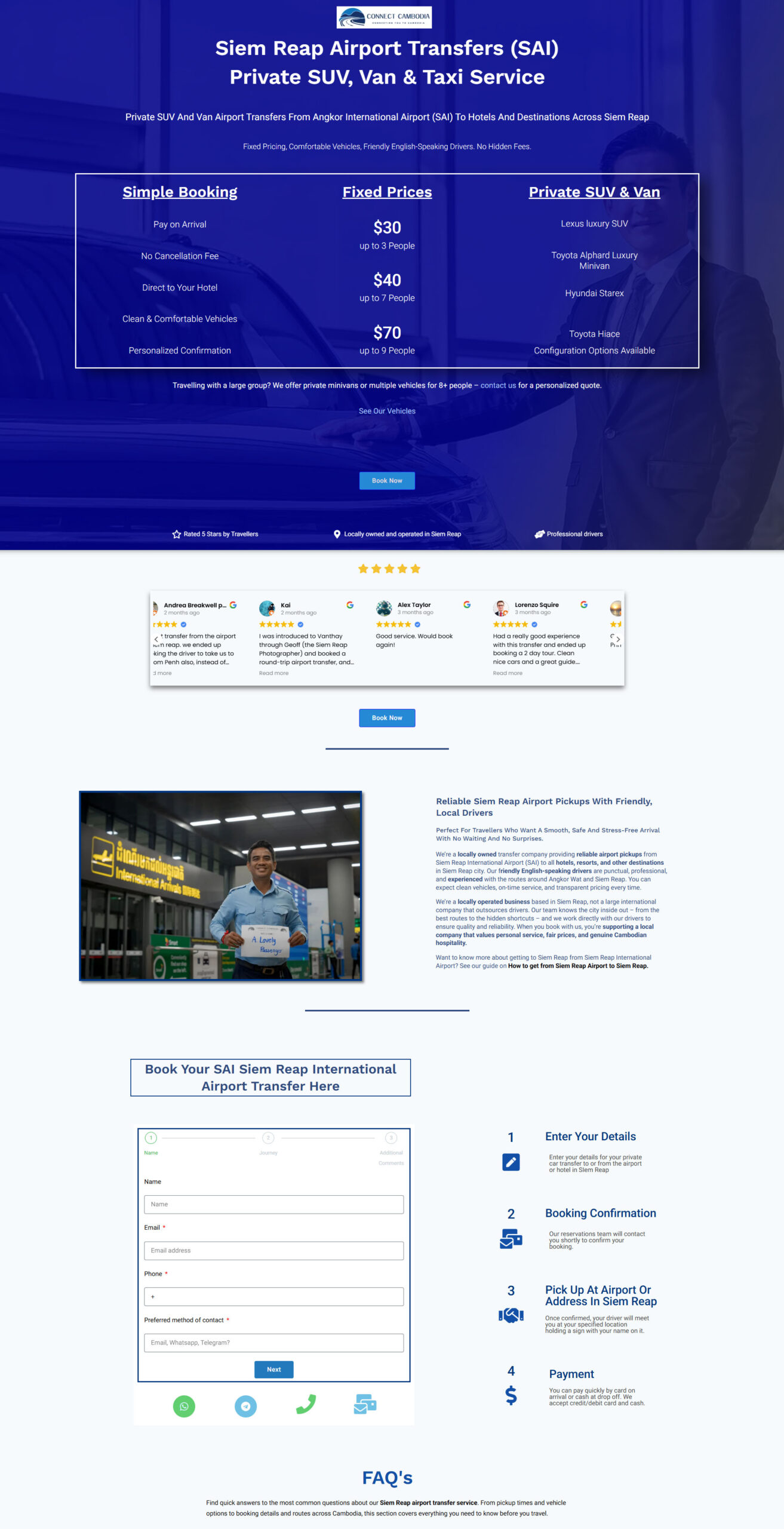 Visitors arriving in Cambodia often look for dependable transport they can book with confidence. The site’s layout, typography, and blue color palette were chosen to convey safety, professionalism, and clarity – reassuring travelers that they’re dealing with a reputable local service.